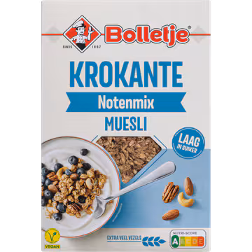 Bolletje Krokante Notenmix Muesli is een krokante ontbijtgranen keuze voor wie houdt van een ontbijt met granen en noten. Dit product valt binnen de categorie ontbijt en ontbijtgranen en is geschikt voor gebruik bij het ontbijt of als toevoeging aan yoghurt, kwark of een dessertkom. In de verpakking zit 375 gr muesli. De productnaam maakt direct duidelijk wat je kunt verwachten: een krokante muesli met notenmix van Bolletje.